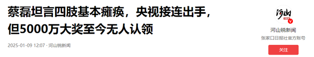 河山锐新闻——2025-01-09《蔡磊坦言四肢基本瘫痪,央视接连出手,但5000万大奖至今无人认领》