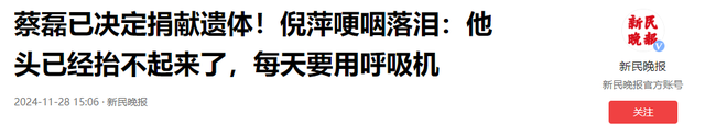 新民晚报——2024-11-28《蔡磊已决定捐献遗体!倪萍哽咽落泪:他头已经抬不起来了,每天要用呼吸机》